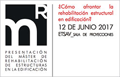 En el transcurso de la misma se presentará el I Master de Rehabilitación de Estructuras en la Edificación de la UPV, que comenzará en septiembre de 2017, en el que la UPV ofrece un descuento a los colegiados de CAATIE Valencia, gracias al convenio de colaboración entre ambas entidades. |