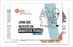 libremente en vuestras comunicaciones o acciones de promoción. Además, en las diferentes plantas del Colegio tenéis a vuestra disposición, hasta fin de existencias, ejemplares impresos. El primero de los dípticos, titulado ¿Para qué necesito un arquitecto técnico?, ya está disponible para su libre descarga y uso en sus dos versiones, castellano y valenciano. |